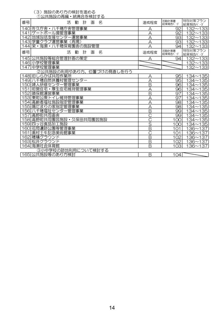 スポンサーリンク 行財政改革大綱総括報告書その2! 2022.03.232022.03.24 総合政策課から 第1次佐久穂町行財政改革大綱の総括報告書が出された。 そのページ数は140ほどにも及ぶ。 これを何回かに分けて紹介。 今回は活動計画書取組事項別進捗結果報告。 とはいっても、膨大になるのでその見出しの部分のみを掲載。 本日、議会改革特別委員会