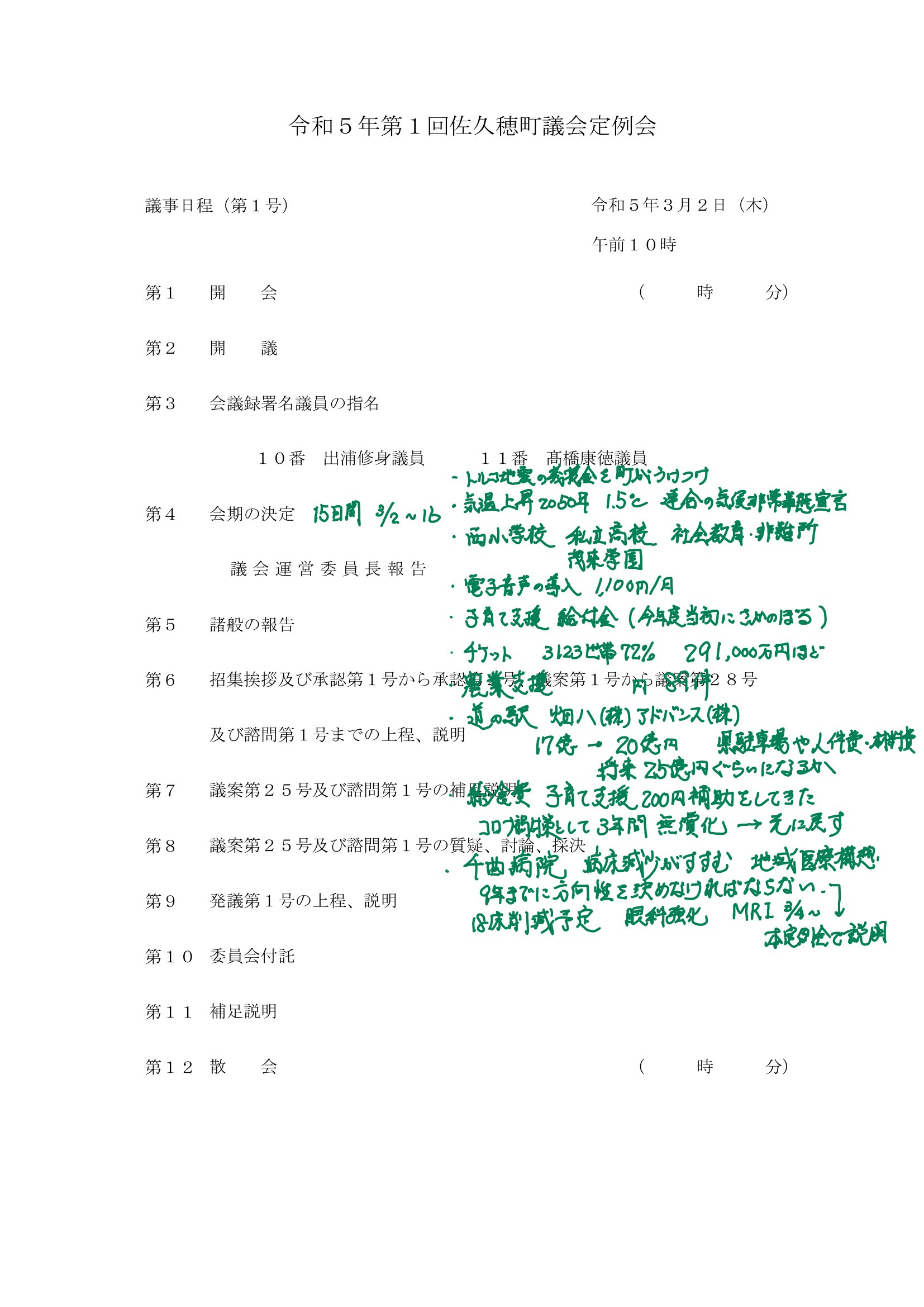 まずは町長招集あいさつにみる令和5年度の佐久穂町の事業概要。