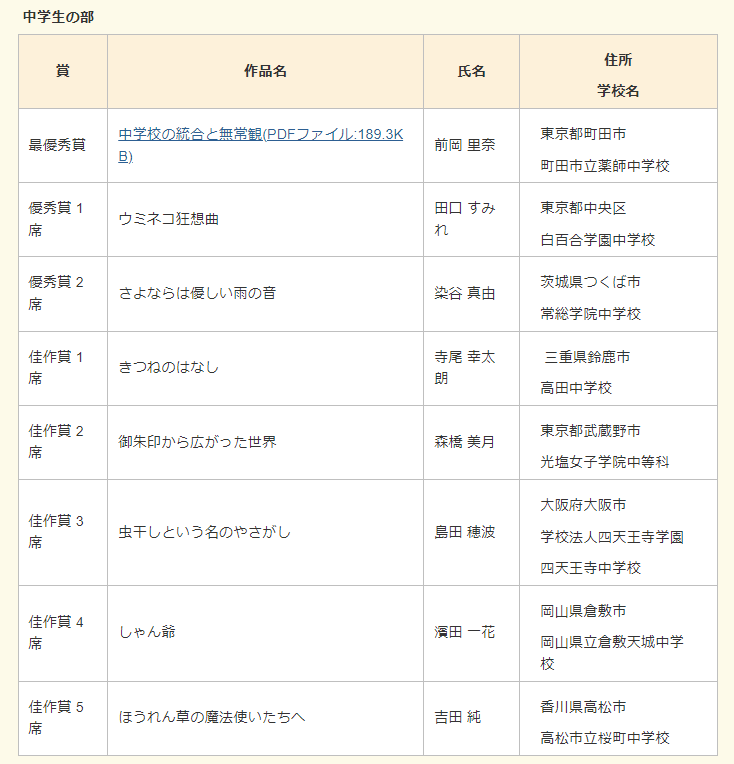 中学生の部の受賞者の一覧表だけ貼っておく。