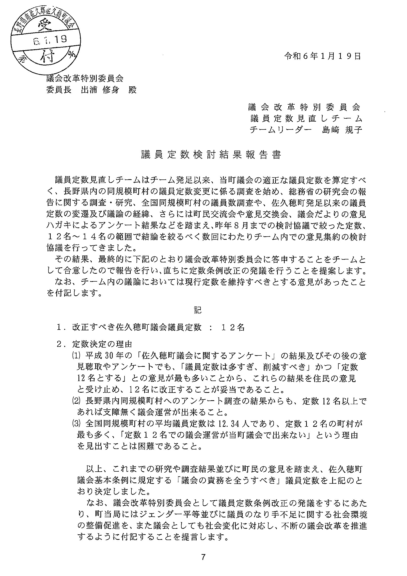 佐久穂町議員定数条例一部改正の発議が報告された。
