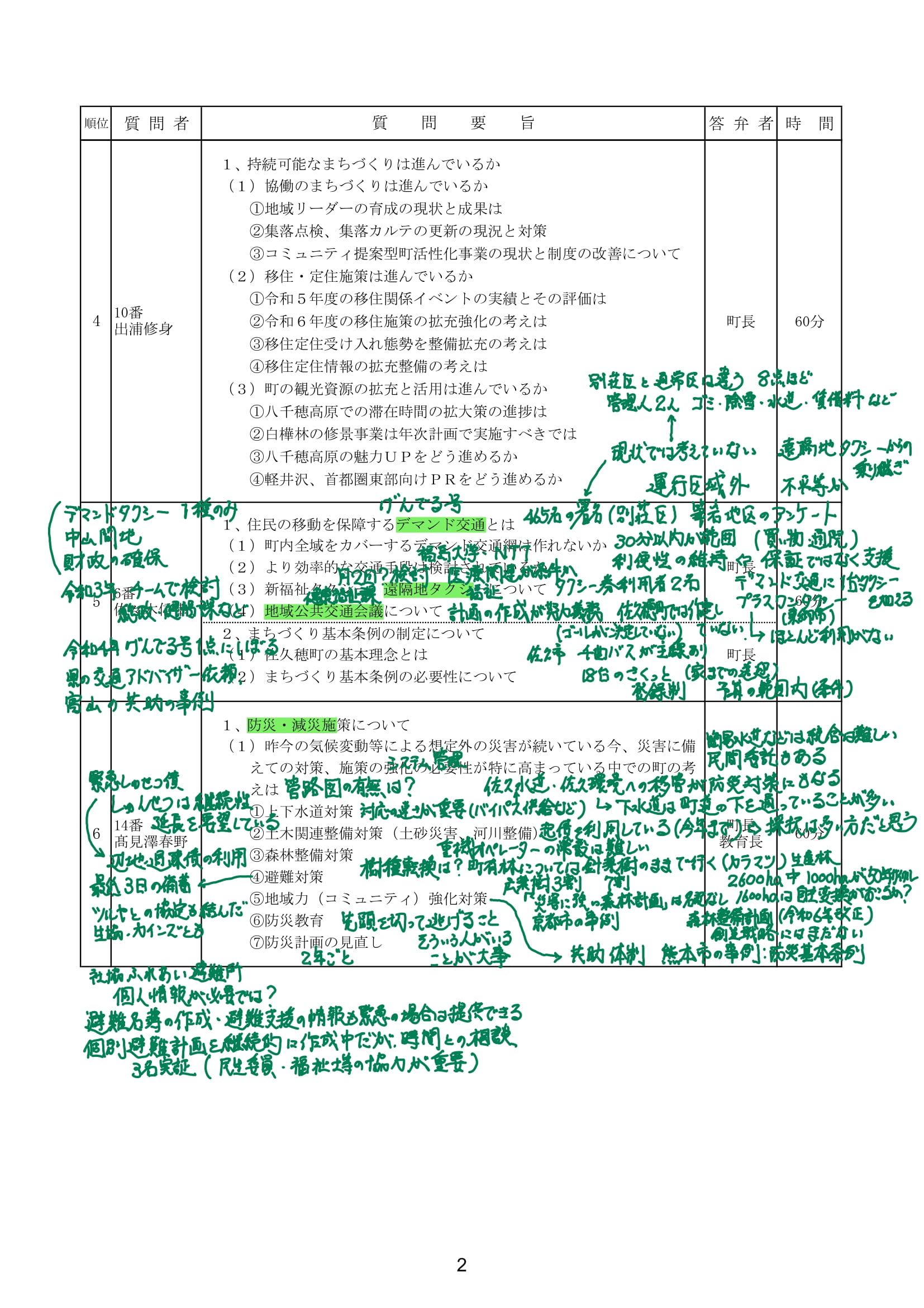 一般質問をする各議員が提出した通告に、