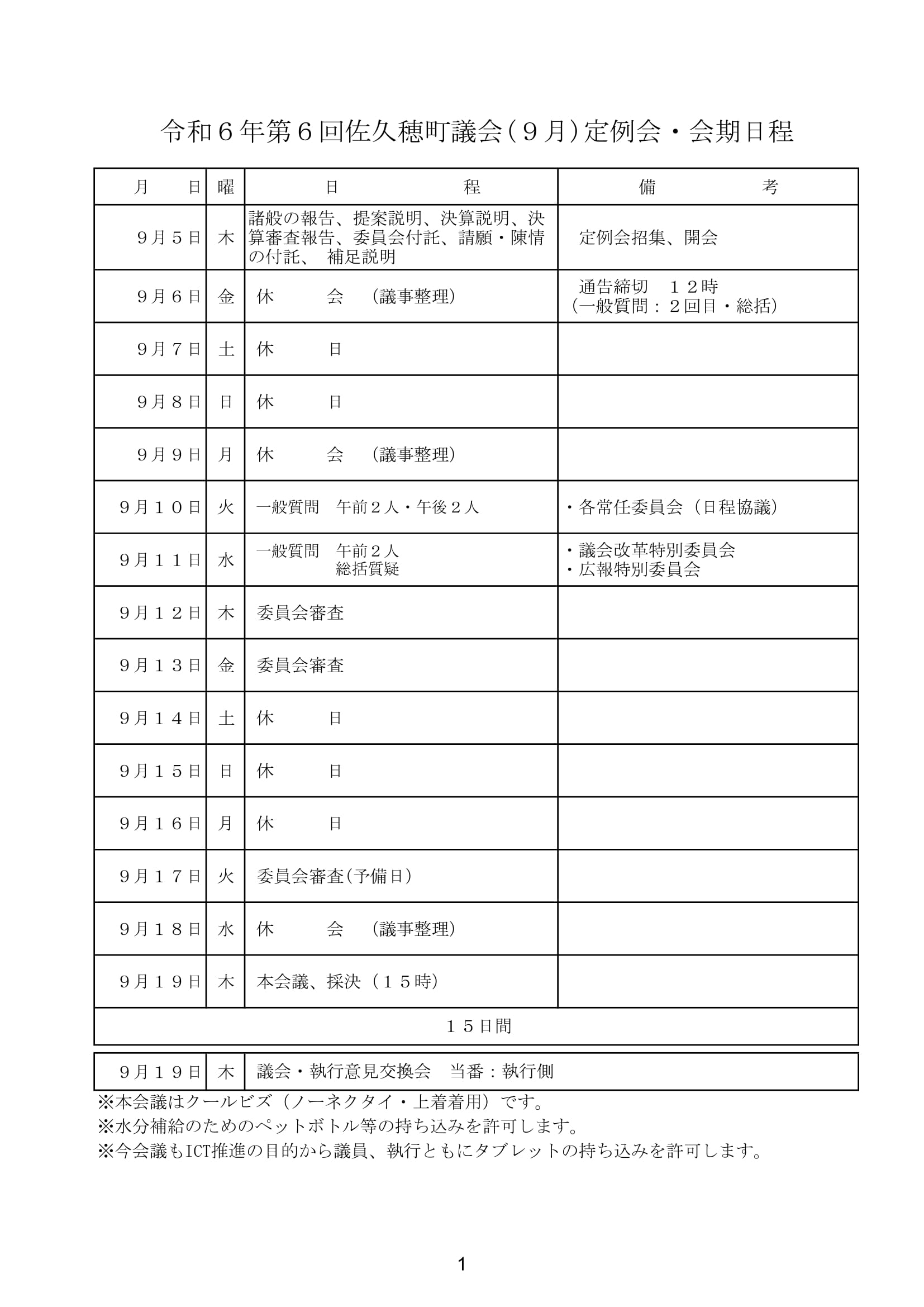 9月定例会の日程は以下の通り。