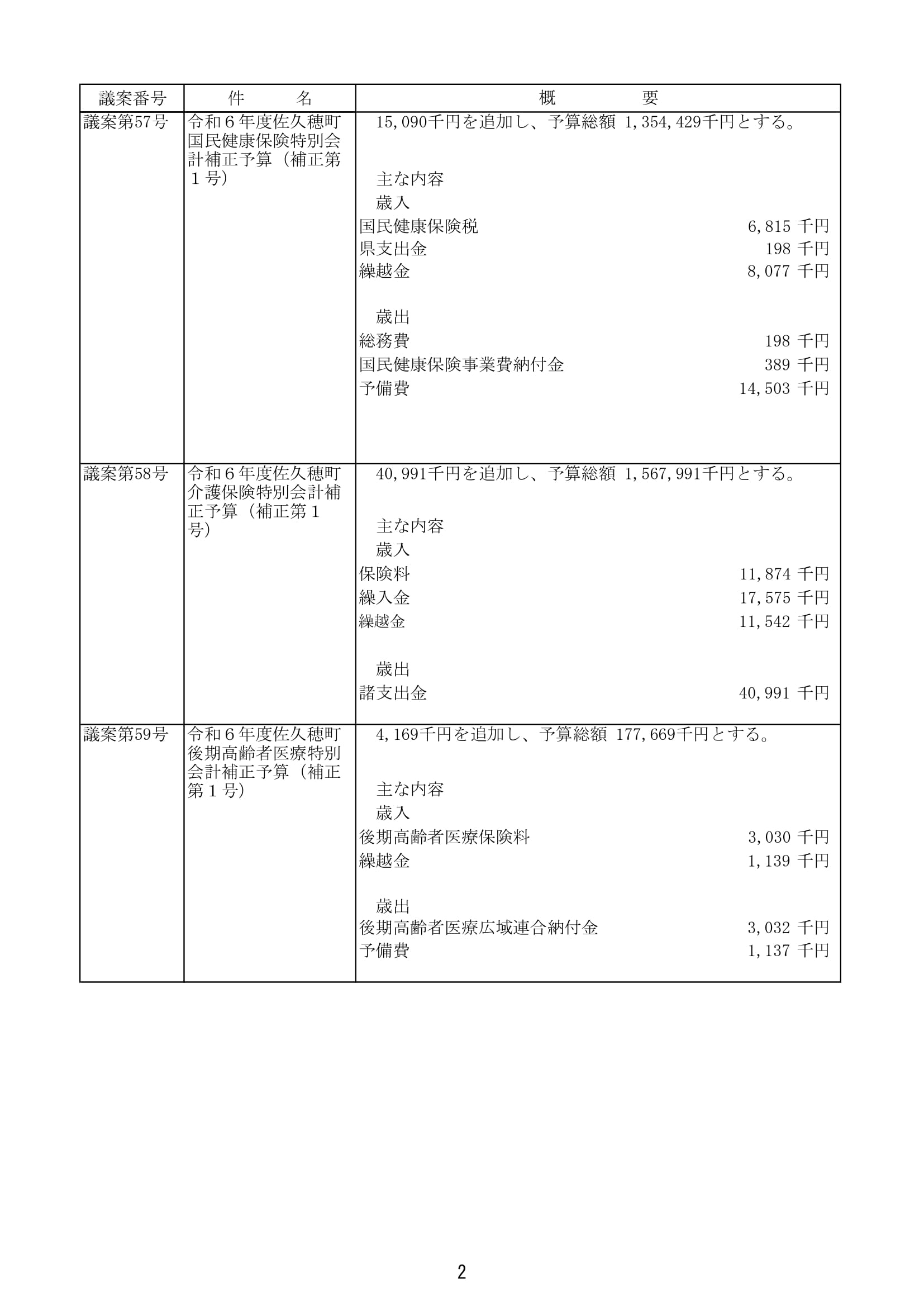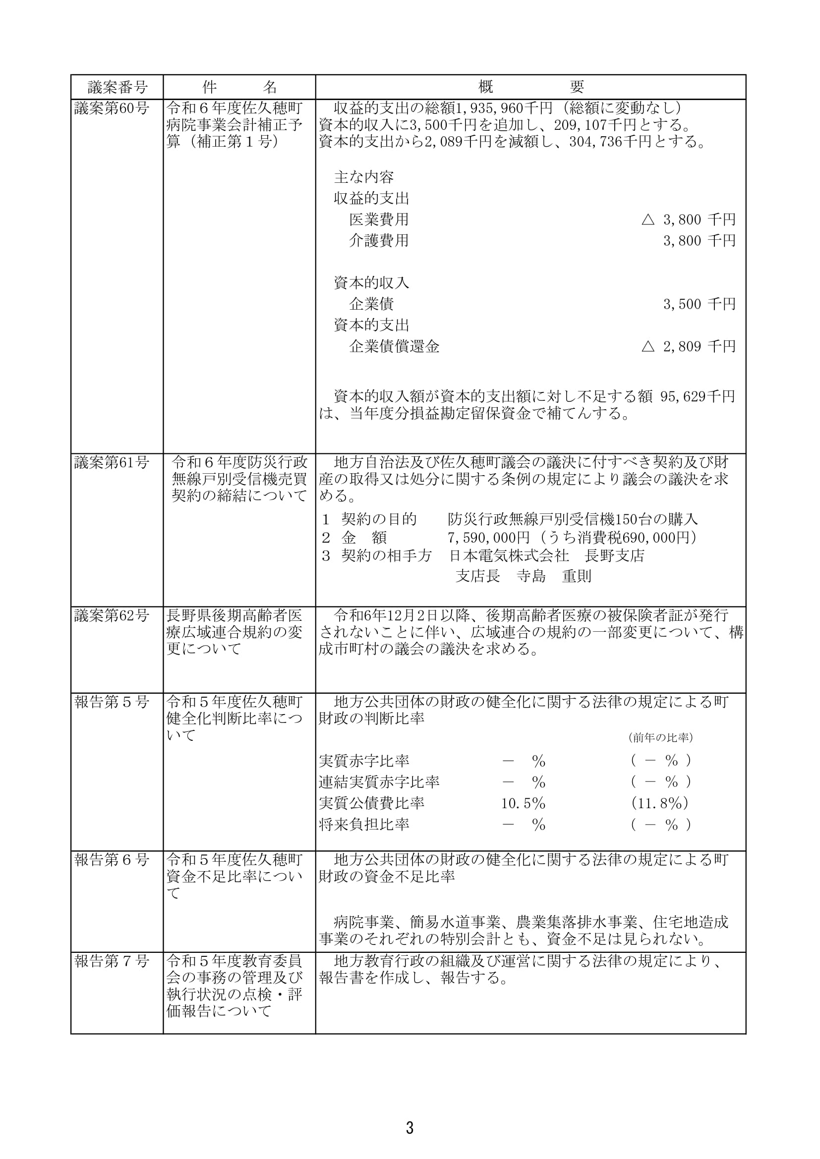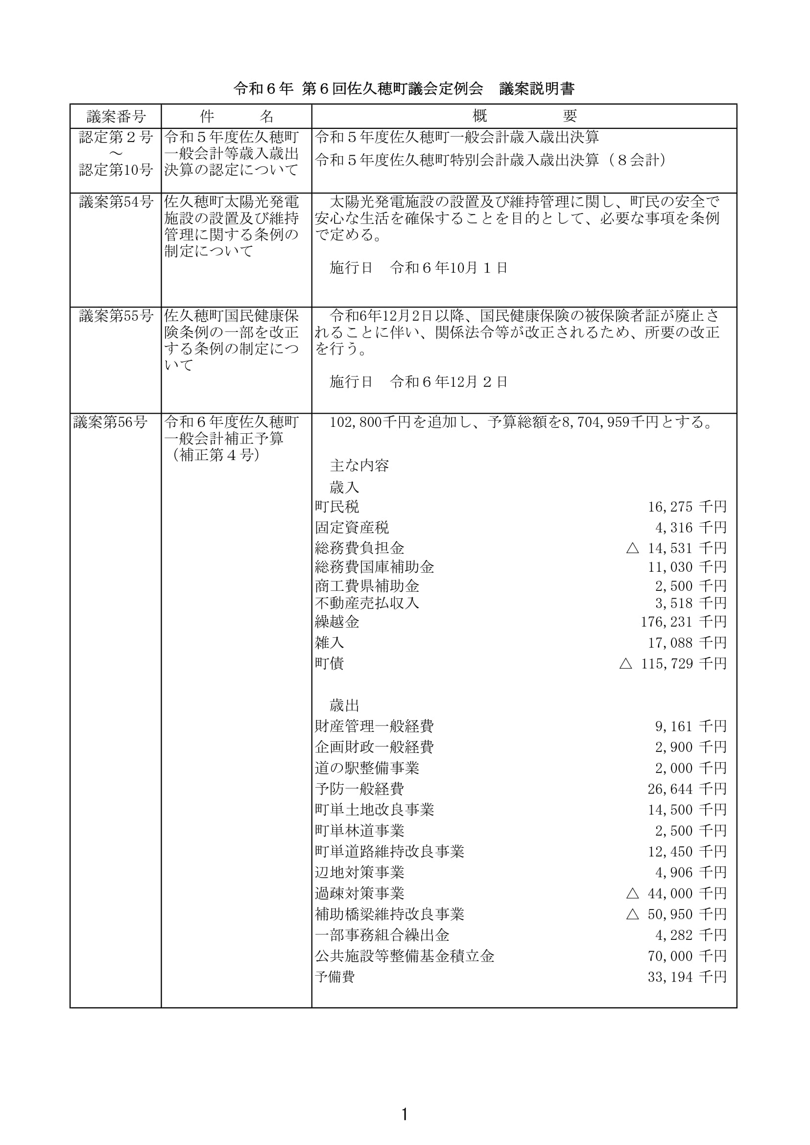 スポンサーリンク 令和6年9月定例会の提出議案の簡単な資料! 2024.09.052024.09.06 今日、9月5日から、 佐久穂町議会9月定例会が始まった。 9月定例会といえば前年度の決算認定。 その他にも今回は太陽光発電施設に関する条例がある。 毎度のことだが、提出された議案の簡単な説明は、 行政側から提出される議案資料がわかりやすいので、 それを載せる。 決算認定である認定第2号から第10号までについては、 会計別の歳出歳入決算の一覧を載せる。 本日、9月定例会開会